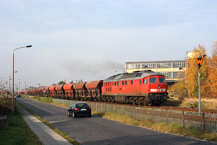 232 601 fährt mit einem Schotterzug aus Forsthaus Eiche in Richtung Magdeburg aus, 02.11.2011. |