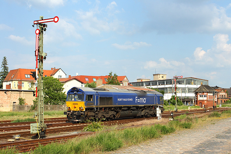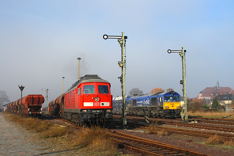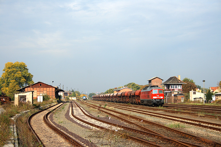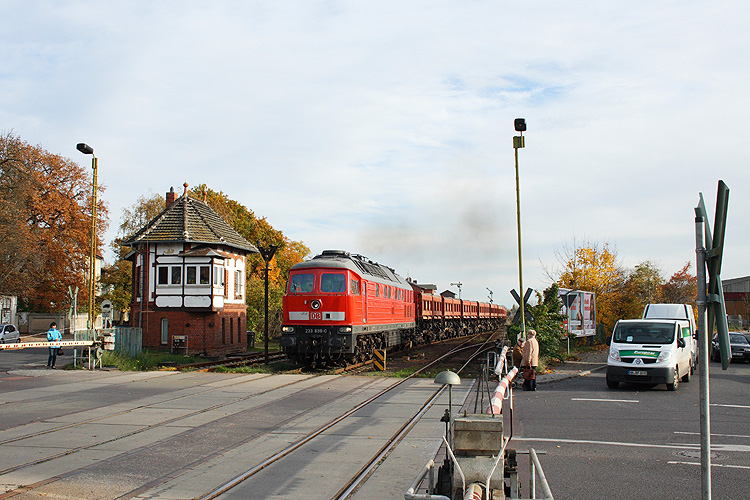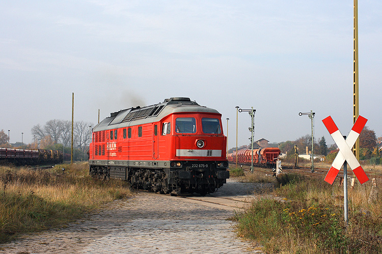 Die Zufahrt zur ehemaligen Güterabfertigung und Ladestraße überquert hier 232 675, sie fuhr an jenem Tag leer zurück in ihre Heimat Magdeburg-Rothensee, 02.11.2011. |