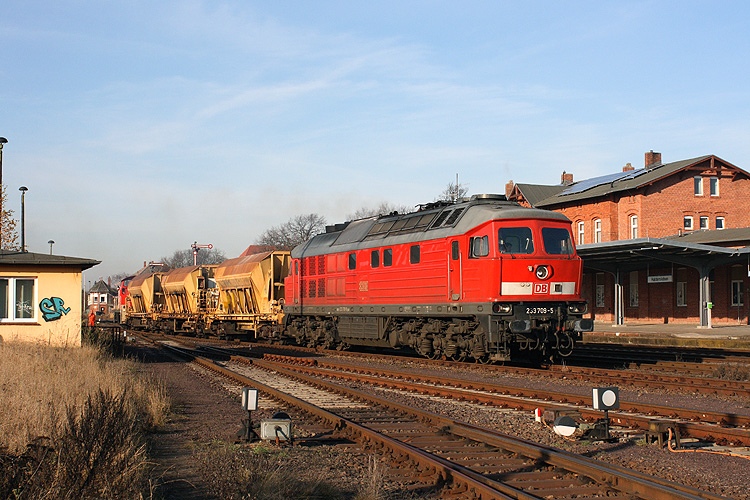233 510 fährt mit einem Schotterzug in Richtung Magdeburg aus, 14.11.2012. |