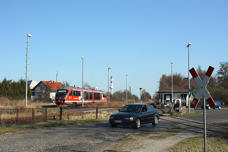 Einfahrt in den Bahnhof Haldensleben hat 642 155 als RB 27720 Magdeburg - Wolfsburg, 25.03.2012. Der Schrankenposten 12 hier am Bahnübergang der Althaldenslebenerstraße ist heute nicht mehr besetzt, die alte Schrankenanlage wird nun vom Stellwerk W1 aus fernbedient. |