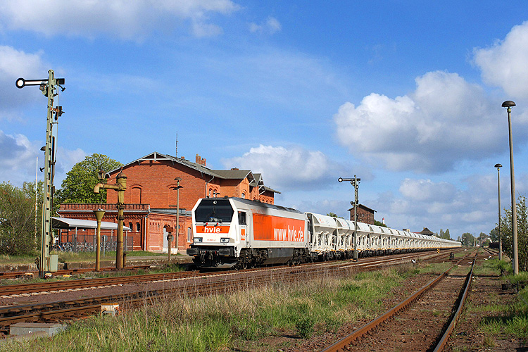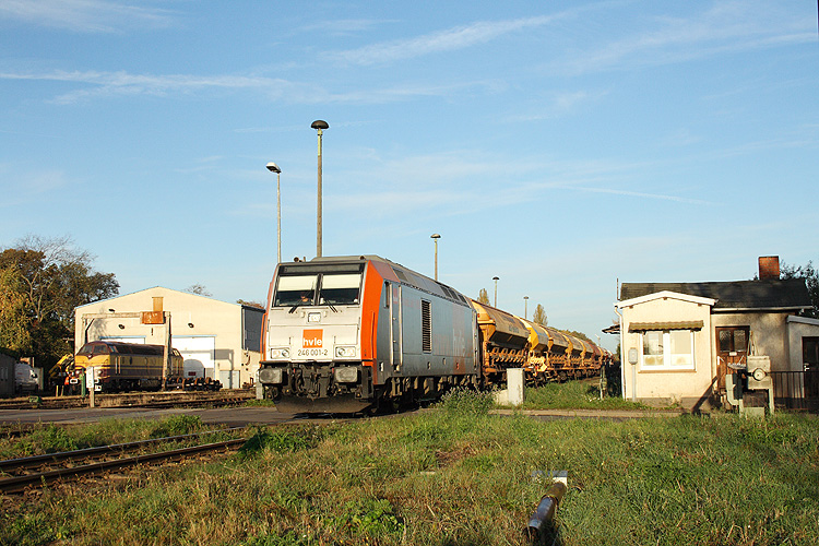 Den Schrankenposten am einstigen Bahnbetriebswerk passiert HVLE 246 001 mit einem leeren Düngerzug vom Barowerk nach Piesteritz, 26.10.2012. |