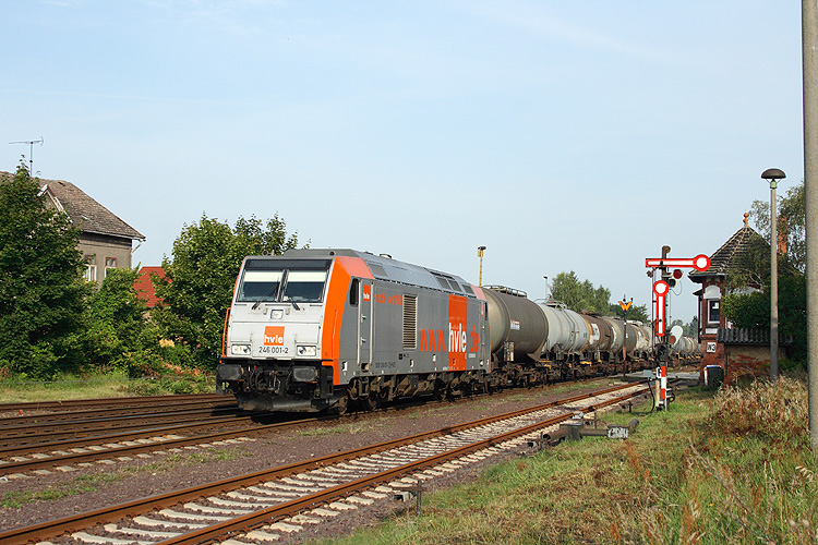 246 001 der HVLE passiert mit einem leeren Flüssigdüngerzug von Baro Bülstringen nach Wittenberg Piesteritz das den westlichen Bahnhofsteil steuernde Stellwerk W3 mit dem markanten Zwergsignal F am Gleis 1, 17.08.2012. |