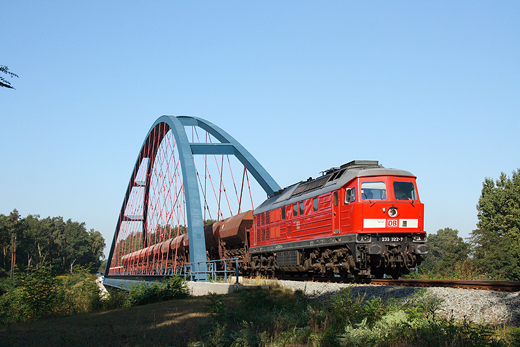 So sieht die Mittellandkanal-Brücke im Westen von Haldensleben heute aus - 233 322 kommt mit einem Schotterzug aus Forsthaus Eiche, 13.09.2012. Die alte Brücke wurde nach Inbetriebnahme der neuen unverzüglich abgebaut. |