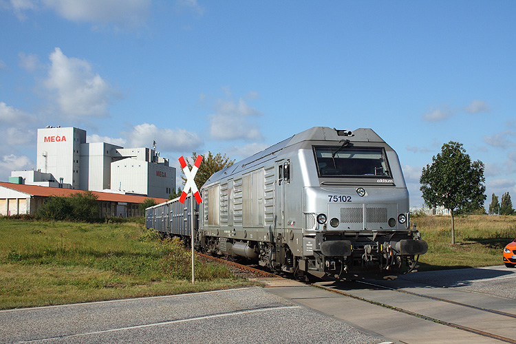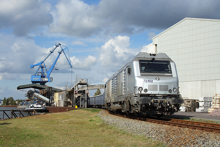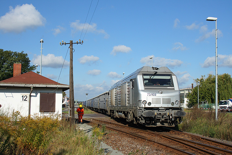 Am einstigen Schrankenposten 12 zweigt von dem ehemaligen Streckengleis nach Eilsleben auch die Anschlußbahn zum Hafen ab. 75102 von akiem im Auftrag der HSL zieht eine Hälfte ihres mit speziellen Steinen für den Kanalausbau beladenen Zuges vor, um diesen dann zur Entladung in das nach links abzweigende Gleis zum Hafen zu drücken, 28.09.2012. |