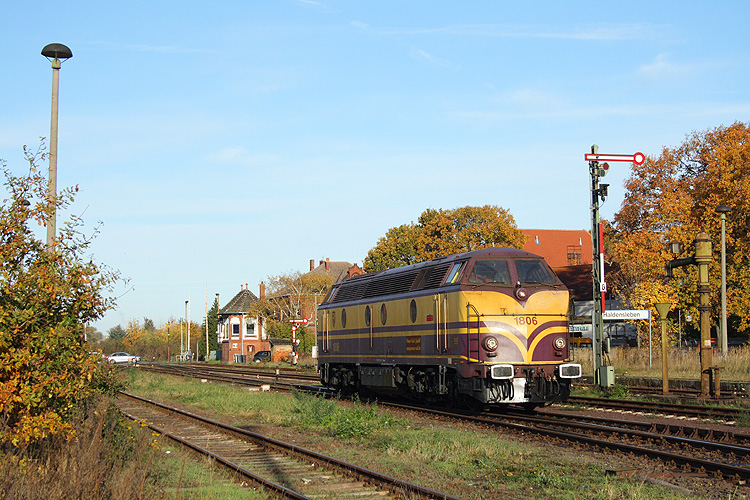1806 von Power Rail wurde in der Werkstatt Haldensleben aufgearbeitet und rollt nun in den Bahnhof, um anschließend ihre Abnahmefahrt nach Flechtingen und zurück zu absolvieren, 26.10.2012. |