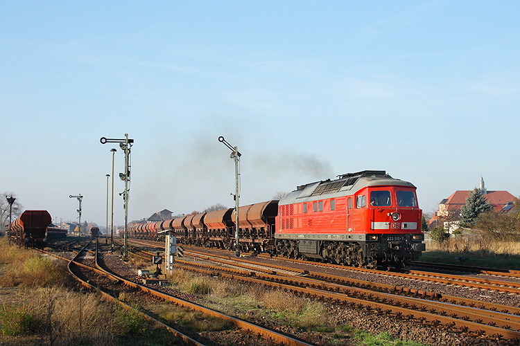 233 510 wartet mit ihrem Schotterzug aus Forsthaus Eiche auf Ausfahrt nach Magdeburg, 12.10.2012. Rechts neben der Lok ist das in Bahnhofsmitte befindliche Befehlsstellwerk B2 zu sehen, links die alte Güterabfertigung, in der DB-Schenker heute noch Räume für ihr Personal nutzt. |