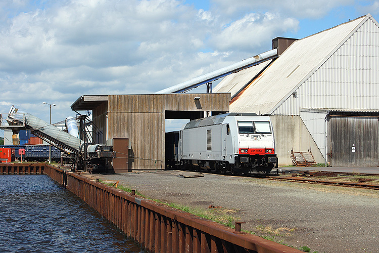 Ein Stückchen weiter passiert die ebenfalls für die HSL fahrende 285 107 die ersten Ladebrücken des Hafens, 21.06.2013. |