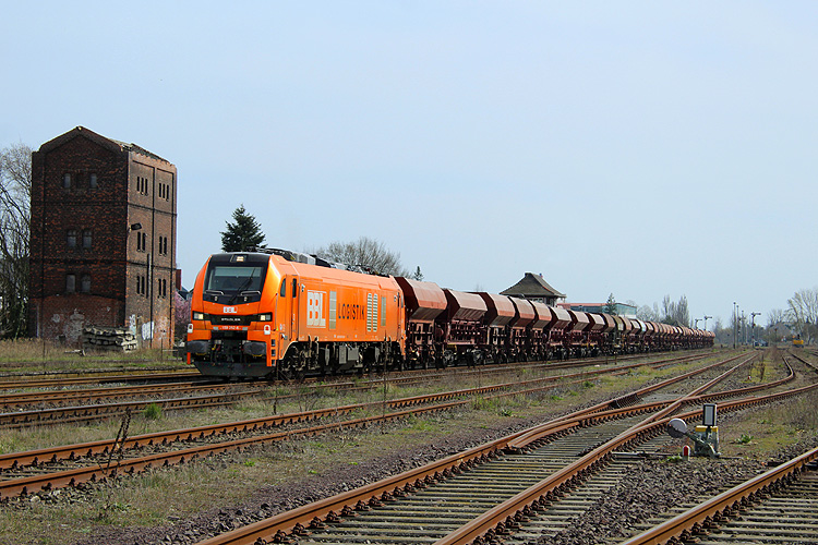 Das Dach des Wasserturmes stürzte 2020 ein. BBL 159 252 war am 27.03.2024 mit einem Schotterzug aus dem Steinbruch Dönstedt gekommen und ist nach dem Kopfmachen nun abfahrbereit in Richtung Oebisfelde. |