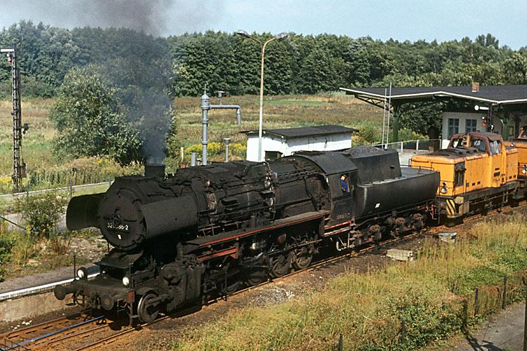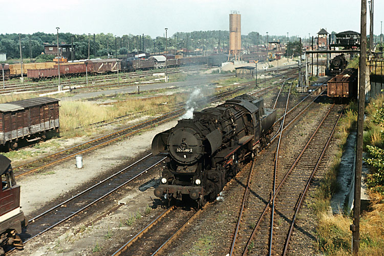 Von meinem Urlaubsort im Sommer 82 bei Potsdam machte ich auch einen Abstecher zum Rangierbahnhof Wustermark, wo auch das Bahnbetriebswerk war. So konnte ich die Wustermarker 52 8086 fotografieren, die zusammen mit zwei 106ern von einem Einsatz aus Richtung Personenbahnhof zurückkehrte, 19.08.1982. Im Hintergrund der Bahnsteig "Wustermark Rangierbahnhof", der sich heute Elstal nennt. |