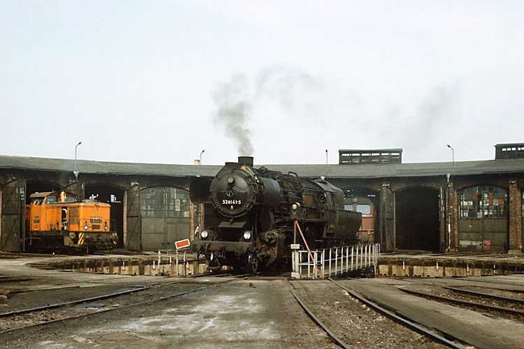 1985 hatte ich einen Hobbyfreund kennengelernt, der eine amtliche Fotogenehmigung für die Bahnbetriebswerke Angermünde und Eberswalde besaß. Als er mir anbot ihn bei einer Tour dorthin zu begleiten, konnte ich nur ja sagen, denn Bw-Aufnahmen hatte ich bisher kaum mal machen können. Im Bw Angermünde angekommen durften wir nach der obligatorischen Sicherheitsbelehrung sofort loslegen, als die hier heimische 52 8141 auf der Scheibe gedreht wurde, 20.04.1985. |