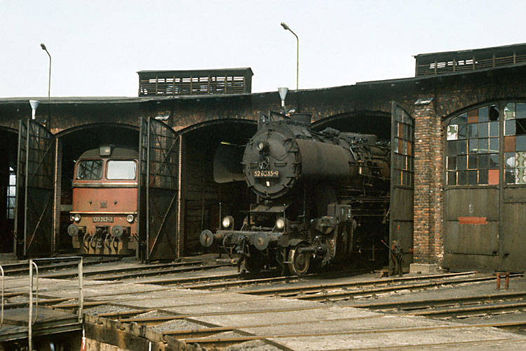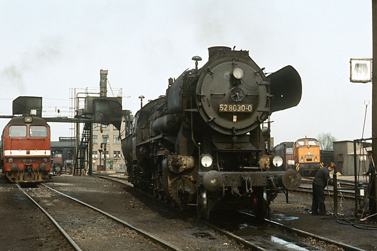 Am darauf folgenden Tag war nicht allzuviel Bewegung auf dem Hof des Bw Angermünde, weil am Sonntag weniger Einsätze zu fahren waren. So standen gleich drei 52er an der ausgedienten Ölbetankungsanlage abgestellt, 21.04.1985. |