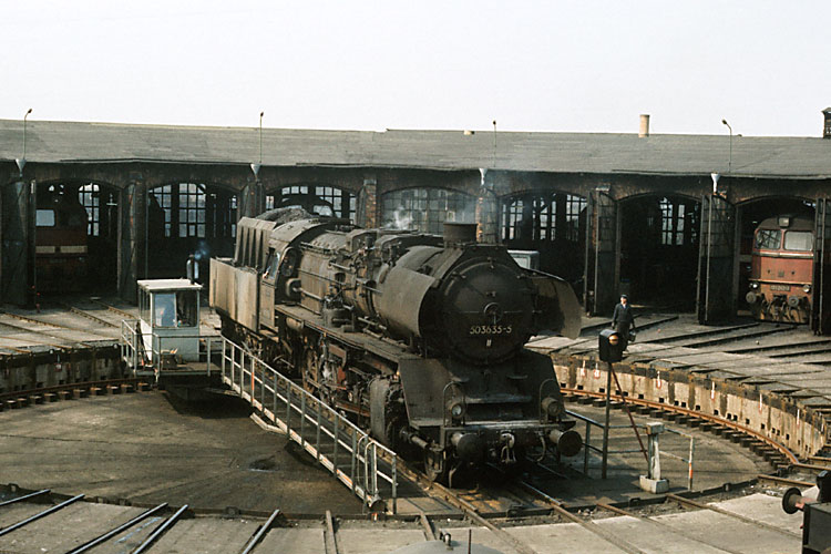 Wegen des geschlossenen Führerhauses fuhren die Angermünder und Eberswalder Personale lieber auf den Reko-52, so das die ebenfalls vorhandenen Reko-50 meist für Heizlokdienste verwendet wurden. An jenem Tag heizte 50 3635 im Bw Angermünde und drehte nach dem Restaurieren für uns eine Ehrenrunde auf der Drehscheibe. |