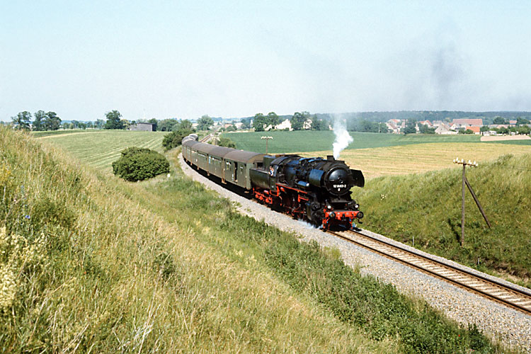 Am 14.06.1986 machte ich nochmal eine Tagestour nach Angermünde. Wegen des Stadtjubiläums von Schwedt fuhr das Bw Angermünde an jenem Tag zusätzlich zu den üblichen Planzügen Personenzugpaare zwischen Angermünde und Schwedt mit Dampf. Zunächst bekam ich aber den planmäßig dampfbespannten Dg 54593 aus Schwedt vor die Linse, mit dem hier 52 8001 Angermünde entgegenrollt. |