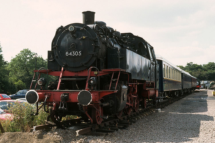 Im August 1994 ging es nach der Landung in London und der Übernahme des Mietwagens in Richtung Norden. Zuerst wurde die auf dem Weg liegende Museumsbahn Nene Valley besucht. Dort staunte ich nicht schlecht, im Depot die deutsche 64 305 zu erblicken. |