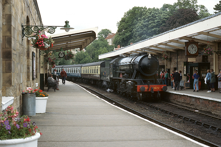 Dann ging es weiter zur North Yorkshire Moore Railway, hier fährt die Kriegslok 3672 mit ihrem Zug in die Endstation Pickering ein. |