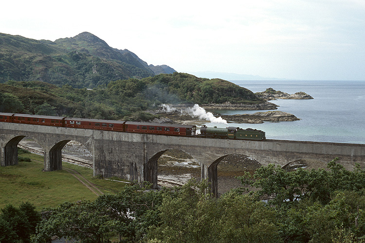 Als nächstes stand ein Besuch der Strecke Fort William - Maillaig in Schottland auf dem Programm. Im Einsatz vor dem täglichen Dampfzugpaar war LNER 2005, hier passiert sie den Viadukt am Loch nan Uamh in Fahrtrichtung Mallaig. |