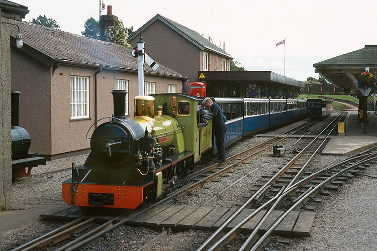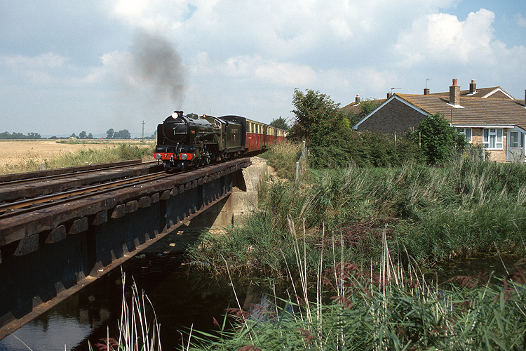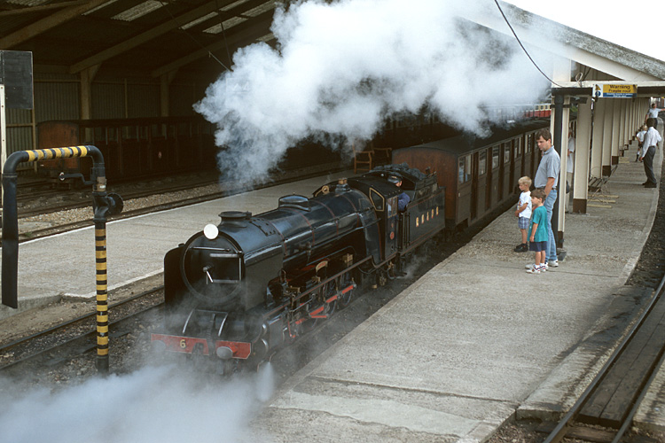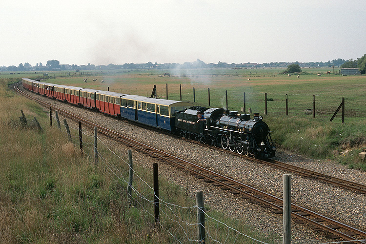 Bei meiner zweiten Hobbyreise nach Großbritannien im August 1996 begann ich mit der Touristenbahn Romney, Hythe and Dymchurch Railway. Diese 15 Zoll Miniaturbahn bietet als zweigleisige Hauptbahn dichten Zugbetrieb, hier die "Southern Maid" mit Zug nach Hythe bei Dymchurch. |