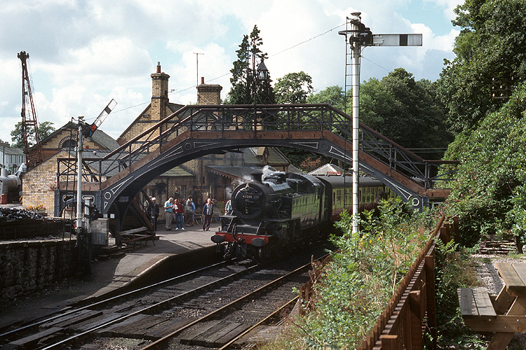 Dann ging es wieder zurück zur North Yorkshire Moore Railway, Kriegslok 90775 verläßt mit einem Zug nach Pickering den Bahnhof Goathland. |