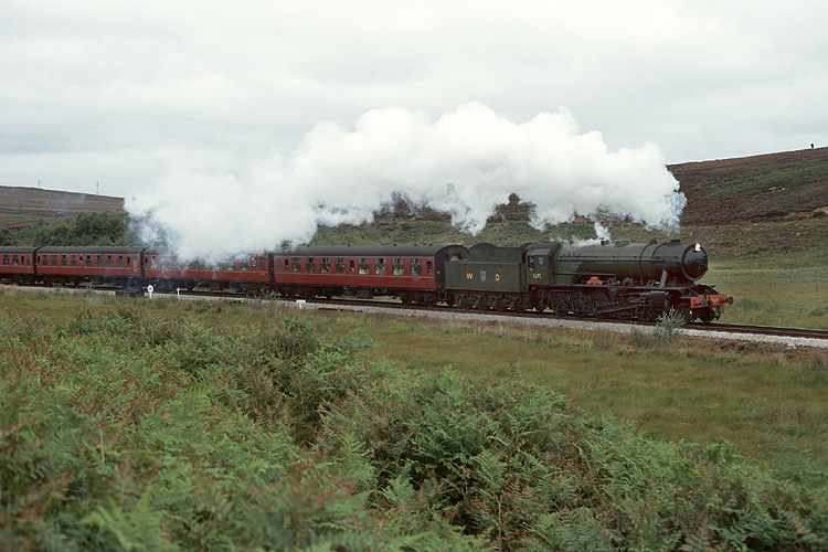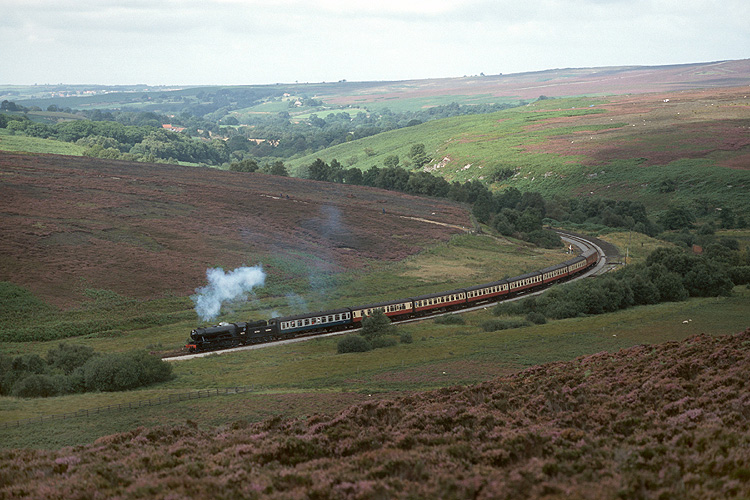 Dann ging es weiter zur North Yorkshire Moore Railway, wo ich bei der ersten Reise 1994 schon einmal gewesen war. Kriegslok 3672 dampft mit ihrem Zug nach Pickering durch das Moor. |