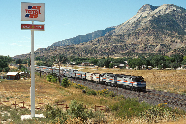Bei Parachute passten wir den "California Zephir" ab, einen der letzten damals noch verkehrenden Fernreisezüge in den USA, bespannt mit Amtrak 399+305. |