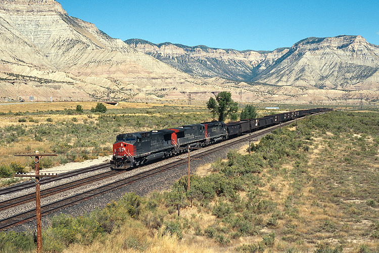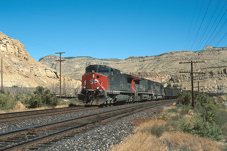 Auf Weiterfahrt in Richtung Westen kamen wir auch durch den Glenwood Canyon, wo diese Aufnahme eines ebenfalls westwärts fahrenden leeren Erzzuges der Southern Pazific Railroad entstand. |
