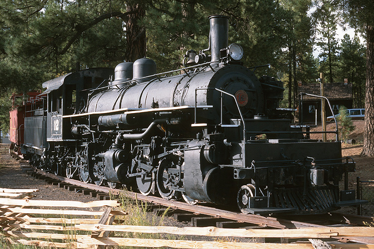 Nach dem Besuch mehrerer Nationalparks war unser nächstes Ziel in Sachen Eisenbahn die Grand Canyon Railroad. Auf der Anreise sahen wir in Flagstaff die imposante 12 der Southwest Lumber Mills, Baujahr 1929, die dort als Denkmal vor dem Pioneer Museum aufgestellt ist. |