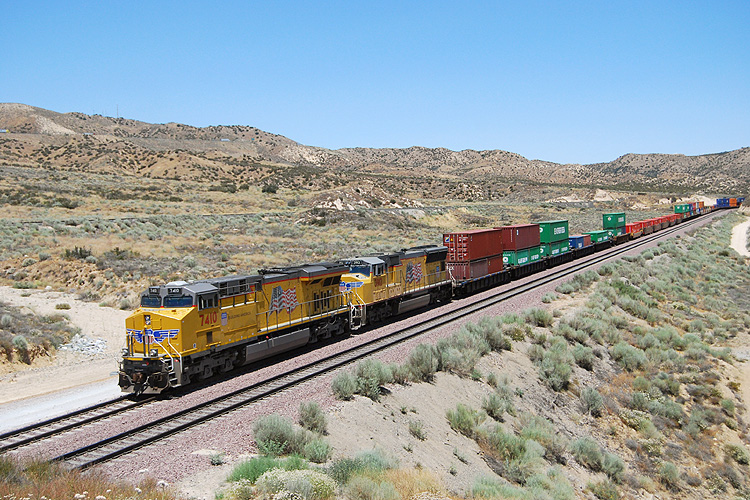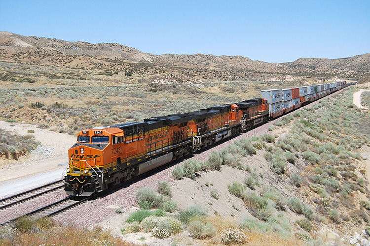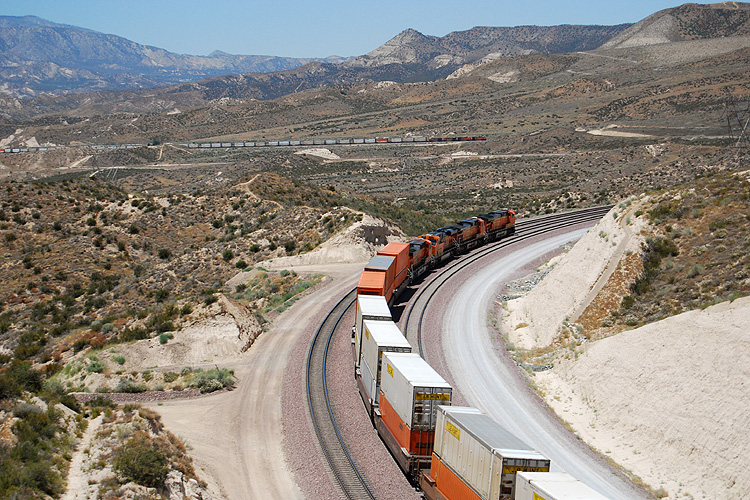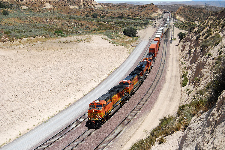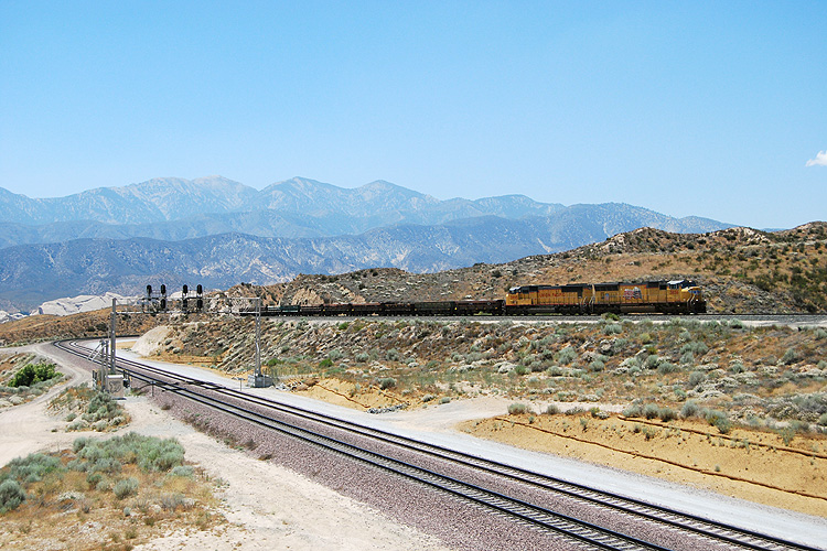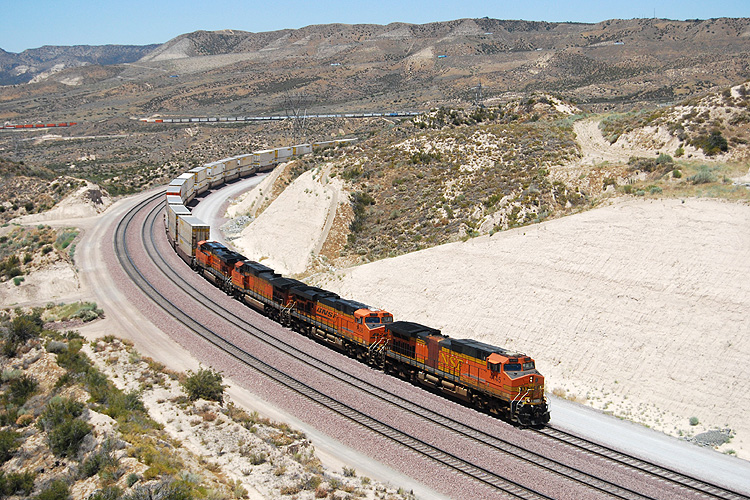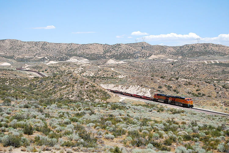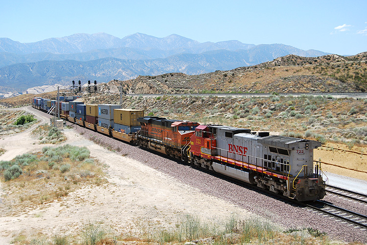 Bei einem USA-Urlaub konnte ich mir am 10.07.2009 1 1/2 Stunden Zeit nehmen, einmal am legendären Cajon-Pass nahe Los Angeles auf Züge zu warten. Diese ließen zum Glück auch nicht lange auf sich warten, zunächst rollte ein Containerzug der Burlington Northern talwärts zum Hafen Los Angeles. |