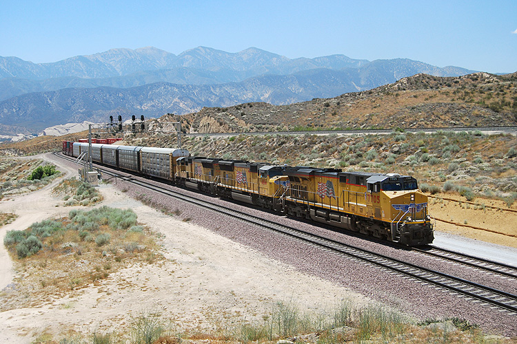 Eine Minute später konnte ich noch diesen mit zwei Loks bespannten leeren Trailerzug der Burlington Northern ablichten, der auf dem unteren der vier Streckengleise talwärts rollte. Danach mußte ich leider los, die Quartiersuche in Los Angeles lag noch an, die wegen der am nächsten Tag stattfindenden Trauerfeier für Michael Jackson ziemlich schwierig wurde. |