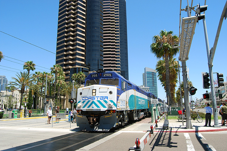 Da in Los Angeles an diesem Wochenende einfach kein bezahlbares Quartier zu bekommen war, ging es erst einmal nach San Diego weiter. Als sich beim Stadtbummel dort laut bimmelnd die Schranken senkten, rechnete ich eigentlich mit einer Straßenbahn oder ähnlichem. Stattdessen kam aber ein "Coaster"-Reisezug in Sicht, überrascht wie ich war, konnte ich leider nur noch diesen Notschuß machen, 12.07.2009. |