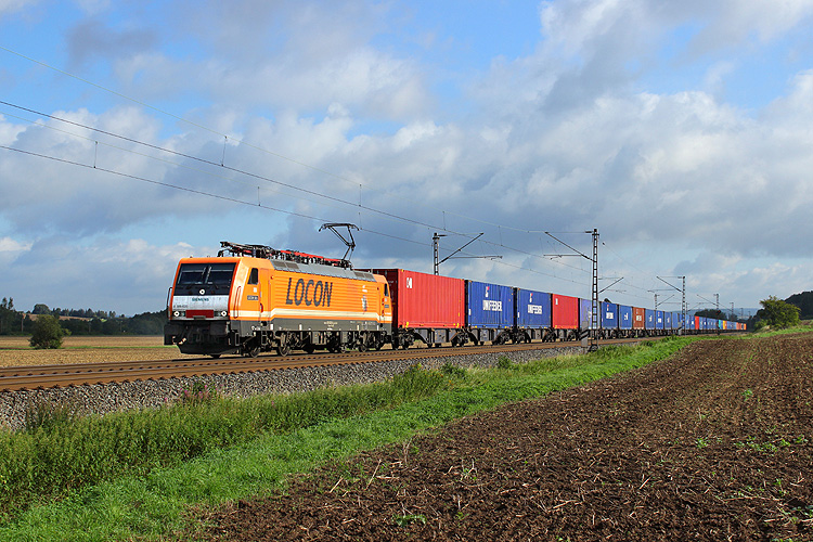 In Gegenrichtung war kurz darauf an gleicher Stelle die 189 820 von Locon zu sehen, ebenfalls mit einem Containerzug. |