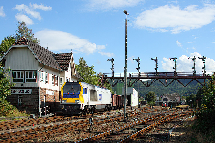 Während eines Harzurlaubes wollte ich unbedingt einmal selbst die berühmte Signalbrücke im Bahnhof Bad Harzburg in Augenschein nehmen. Die ADE Maxima 264 007 rangierte an jenem Tage ihren Schotterzug in die Beladung, 29.08.2012. |