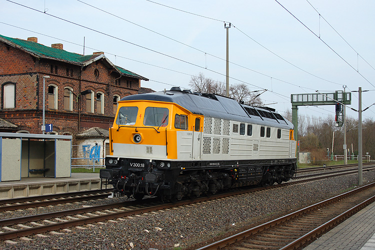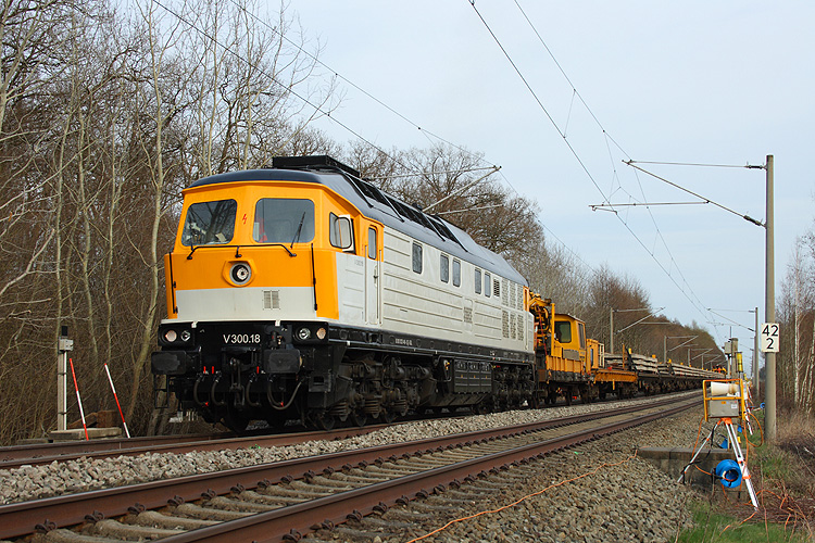 Im Frühjahr 2013 wurden auf einigen Abschnitten der Strecke Stendal - Salzwedel die Gleise erneuert. Die Bespannung des Umbauzuges war Aufgabe der SGL, hier V300.18 bei Fleetmark, 21.04.2013. |
