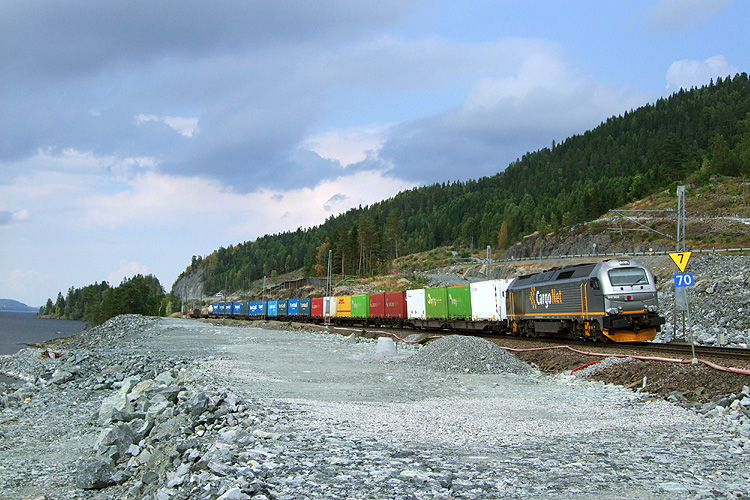 Auf der Rückreise von einem Norwegen-Urlaub am Nordfjord sah ich bei Lillehammer zufällig einen Cargo-Net-Containerzug, der ebenfalls in Richtung Oslo fuhr. Da es mir gelang, etwas Vorsprung herauszufahren, konnte ich bei Minnesund noch ein Foto machen. Zuglok war die Vossloh 312 002, 27.07.2013. |