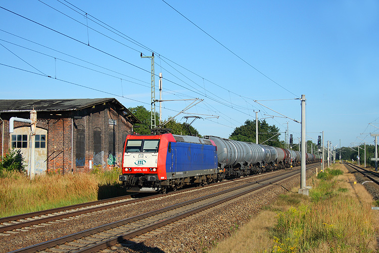 Am 15.08.2013 unternahm ich eine Tagestour an die Strecke Nauen - Wittenberge. Dort war ich seit dem Ende der Dampflokzeit 1987 nicht mehr gewesen und freute mich, das wenigstens der Lokschuppen der ehemaligen Einsatzstelle Neustadt/Dosse noch vorhanden ist. 185-CL 003 der ITL fuhr mit einem Kesselzug in Richtung Berlin. |
