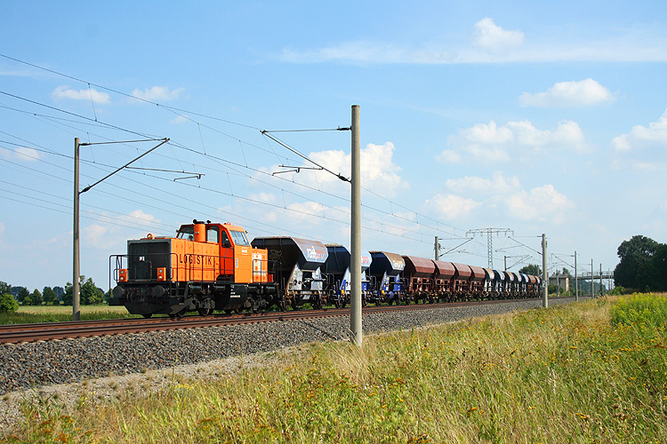 In Hohenwulsch erwischte ich am 26.07.2012 die gerade frisch für die ABEG umgestaltete 140 857 der EGP, die mit dem Containerzug Schkopau - Hamburg unterwegs war. |