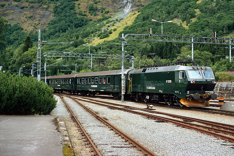 Eine Mitfahrt nach Myrdal, 864 Meter höher an der Hauptstrecke Oslo - Bergen gelegen, mußte natürlich sein. Hier steht unser Zug abfahrbereit in Flam. |