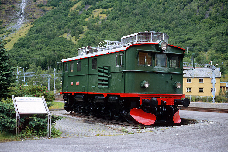 Gefahren wird mit modernen Loks, ein älteres Modell wurde in Flam als Denkmal aufgestellt. |