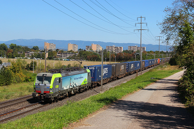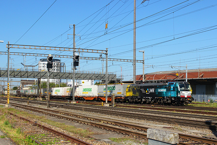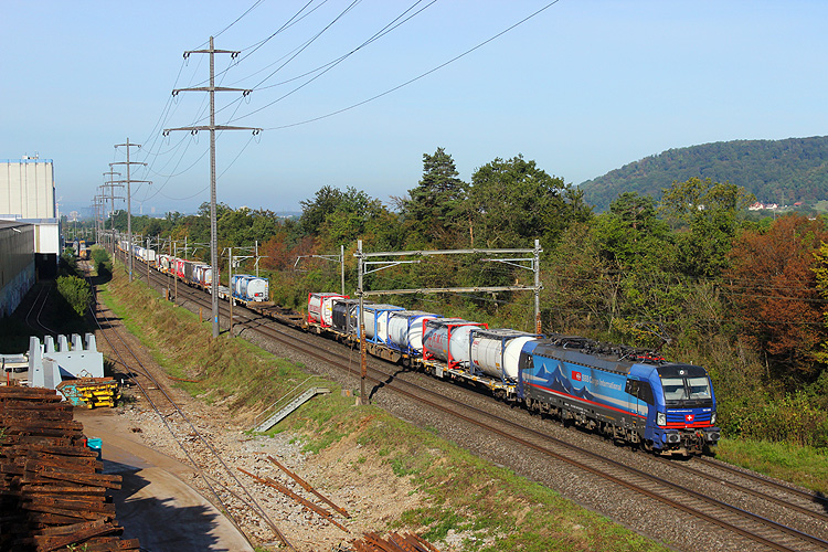 Danach ging es wieder in die Schweiz zum Bahnhof Pratteln. BLS 193 717 war mit einem Ambrogio-KLV in Richtung Brugg unterwegs. |