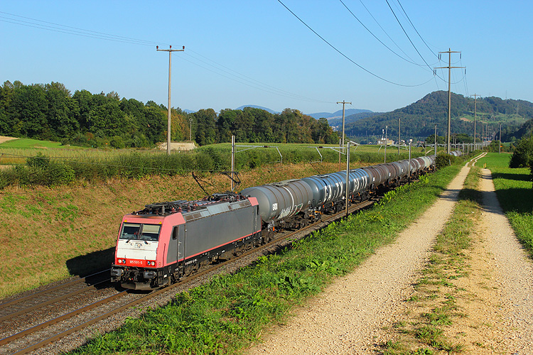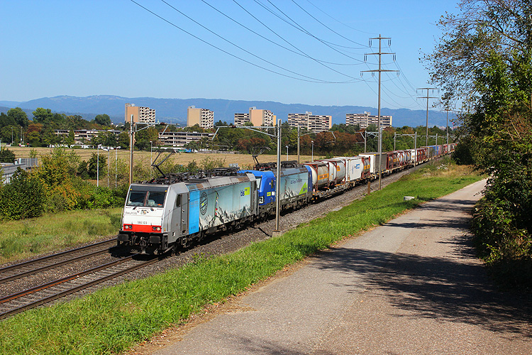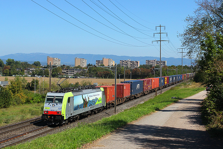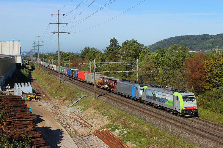 BLS 485 002 + 186 103 fuhren mit einem Containerzug in Richtung Liestal. |