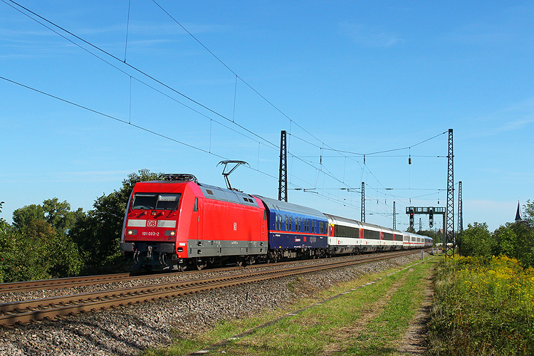Am 05.09.2023 ging es an die deutsche Rheintalbahn nach Heitersheim. 101 003 kam mit dem stark verspäteten Nightjet NJ 403 Amsterdam - Zürich. |