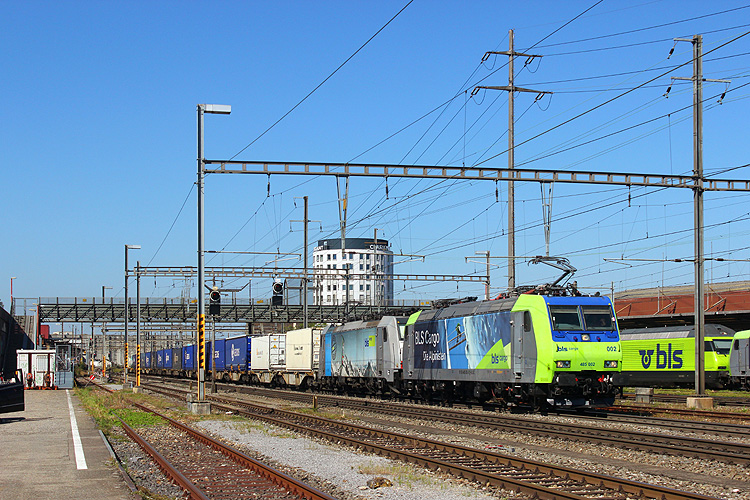 BLS 475 408 fuhr mit einem GTS-Containerzug in Richtung Basel. |
