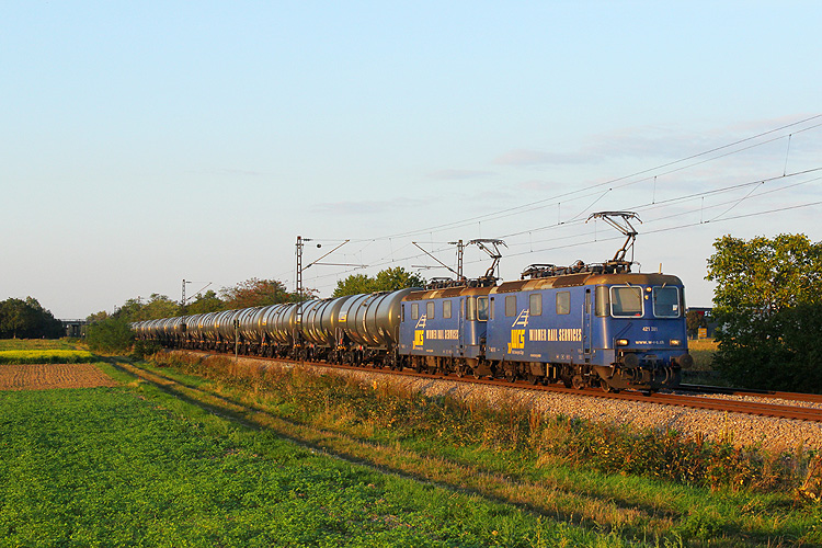 Im letzten Sonnenlicht kamen noch WRS 421 381+373 mit Kesselzug in Richtung Basel. |