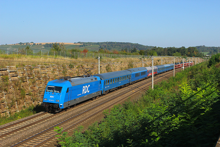 Am 10.09.2023 ging es wieder nordwärts, aber vorher mußte noch bei Eimeldingen der RDC-Autozug RDC 1798 Hamburg Altona - Lörrach mit 101 031 abgelichtet werden. |