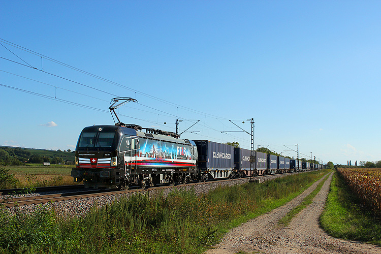 Der 08.09.2022 war nochmal für die Rheintalbahn reserviert - SBB Cargo 193 532 "Nightpiercer" mit Containerzug in Richtung Freiburg durchfährt Heitersheim. |