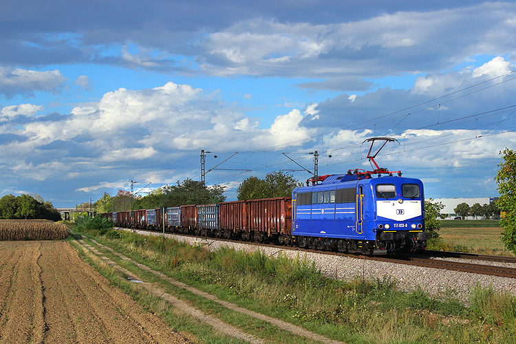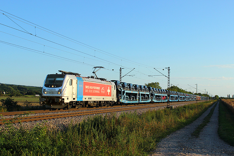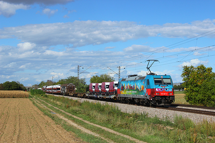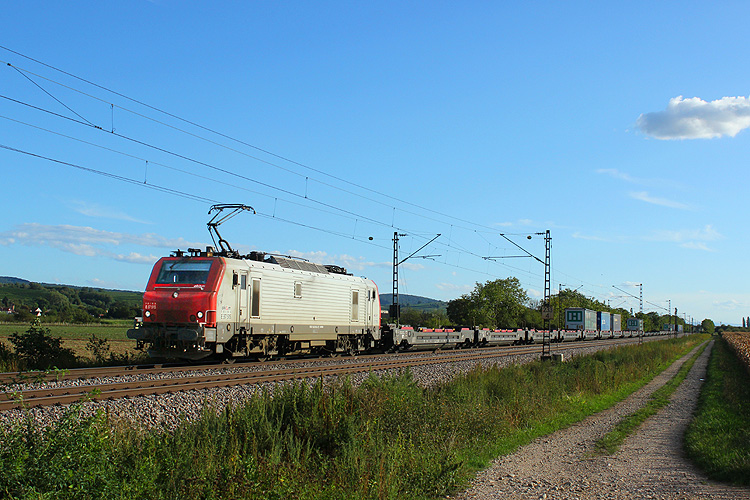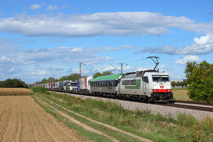 Nach einem kurzem Stellungswechsel ging es zwischen Buggingen und Müllheim weiter. Hier bekam ich unter anderem SBB-Cargo 186 907 mit einem Cargo-Beamer von Novara nach Freiburg vor die Linse. |