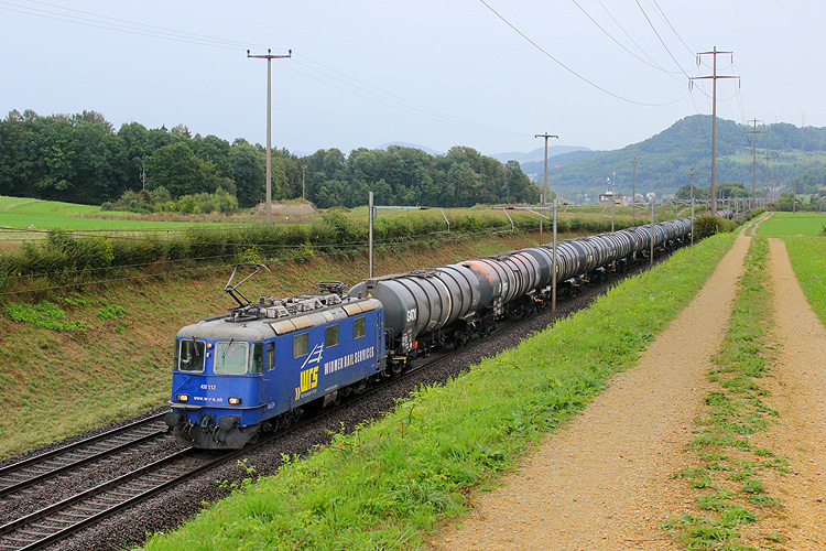 Danach folgte ich der Rheinfeldener Strecke und fand bei Wallbach eine passende Fotostelle. WRS 430 112 fuhr mit einem Kesselzug in Richtung Basel. |