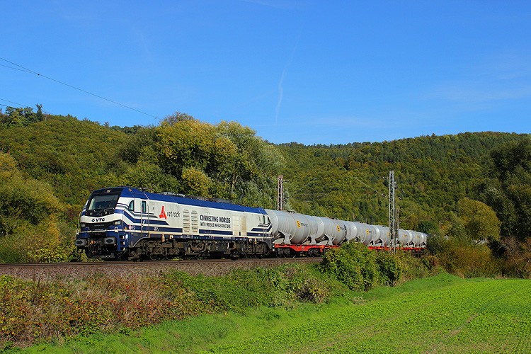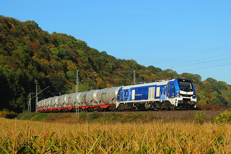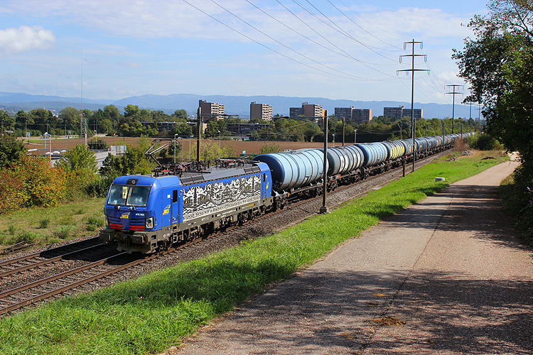 Stellungswechsel zum Autobahn-Grenzübergang - WRS 475 902 mit Kesselzug in Richtung Basel. |