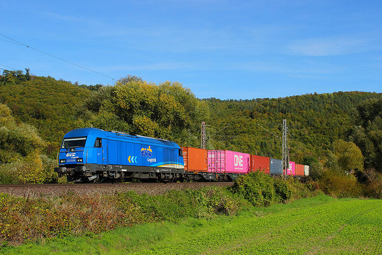 EVB 223 034 fuhr mit einem Containerzug nordwärts. |