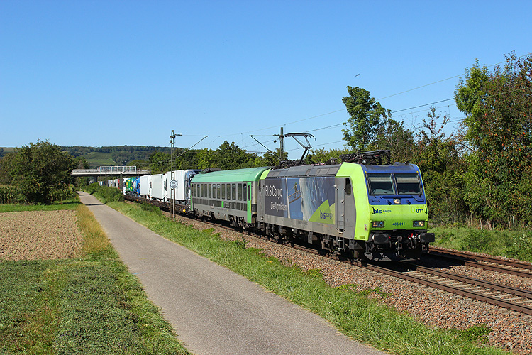 Weil es so ergiebig war, ging es am 13.09.2019 noch einmal früh morgens an die Rheintalbahn nach Heitersheim. Den Anfang machten BLS-Cargo 485 001+011 mit einem Cargo-Beamer von Novara nach Freiburg. |