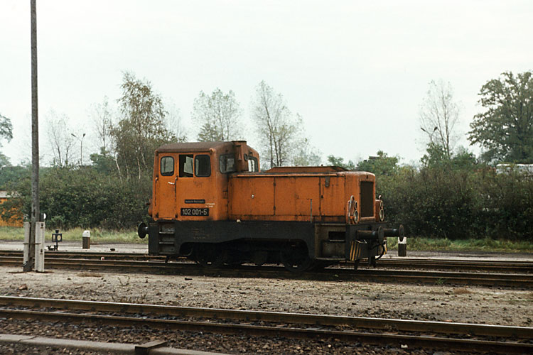 Für den Rangierdienst und die Anschlußbedienung war in Gardelegen eine Lok der Baureihe 101 / 102 des Bw Stendal stationiert, am 23.10.1982 war 102 001 vor Ort. |